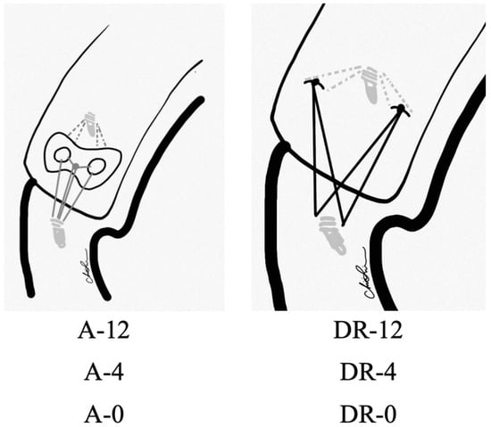 In the A-12 groups, one double-loaded suture anchor was inserted in the medial row first. The sutures were then passed through the torn tendon and the holes of the PEEK augment. After knot tying, four stitches were pulled laterally and fixed into greater tuberosity, with one knotless anchor as the lateral row fixation. The same procedure was carried out in the A-4 and A-0 groups. In the DR-12 group, the same fashion of anchor placement was performed without the PEEK augment, mimicking the commonly used DR technique []. In the DR-4 and DR-0 groups, the infraspinatus tendons were repaired with two double-loaded suture anchors in a double-row manner and knotted at the medial and lateral edges of the tendon footprint. All suture configurations are demonstrated in Figure 1. The A-12, A-4, and A-0 groups served as experiment groups, while DR-12, DR-4, and DR-0 served as control groups.