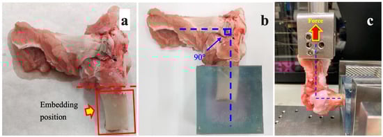 In the 12-week and 0-week groups, the humerus was fixed in the embedding fixture (Figure 3a,b). The infraspinatus muscle was erected 90 degrees from the humerus and pulled perpendicular to the sagittal plane of the fixture, as shown in Figure 3c.