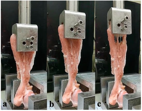 The test machine provided a continuous pulling force at a 75 mm/min rate until failure of the infraspinatus muscle (Figure 4a–c). The experiment stopped until the tensile force decreased to 0. Damage to the test specimen was assessed after each test and photographed. The maximum pull force (N) and load displacement (mm) during the study were recorded. In the 0-week group, the specimens were harvested right after the surgery, and the same experimental setup was applied.
