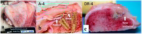 At the time of euthanasia, continuity between the repaired tendon and bone was observed in all A-12 and DR-12 groups. No anchor was pulled out. In A-4 and DR-4 groups, all specimens were cut at the infraspinatus muscle part at the final timepoint. The specimens in the A-4 group showed the well-developed fibrotic appearance of the enthesis, as shown in Figure 5a. An atrophic and retracted native cuff tendon and newly formed enthesis, lying laterally between the augment and knotless anchor, were observed and are shown in Figure 5b. A new enthesis of DR-4 specimens was also observed, but was thinner (3.5 mm, Figure 5c) than that of the A-4 group (7.5 mm) in gross appearance.