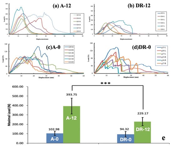 Load-displacement plot of (a) A-12 group, (b) DR-12 group, (c) A-0 group, and (d) DR-0 group and (e) comparison among the 4 groups. The pull-out strength of A-0 vs. DR-0 and A-12 vs. DR-12 group. The error bar stands for standard deviation (n = 6). Statistical significance between A-12 and DR-12 is observed (*** p < 0.001, one-way ANOVA for independent samples).