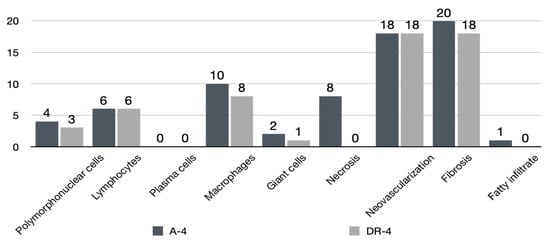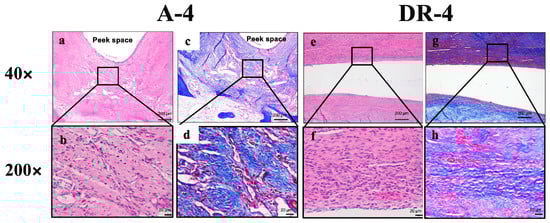 Histopathological cell response and tissue alternation in tendon-to-bone insertion site with (A-4) and without (DR-4) PEEK augment.