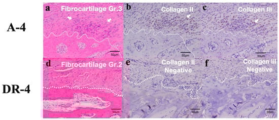 Within the new footprint area of the A-4 group, type III collagen was widely found in the tendon (4 out of 6) and cartilage (3 out of 3). Type I collagen was positive in the cartilage of only one specimen in the A-4 group (Table 10). The H&E stain and IHC stain in the new footprints area of the A-4 group and DR-4 groups are shown in Figure 9.