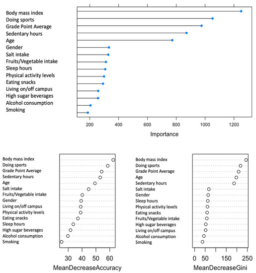 Figure 1 illustrated ten features that are salient to the prediction model of mental well-being. This is corroborated by the error plot, variable importance plot (accuracy), and the Gini index (Figure 2). The ten salient indicators for mental well-being rank in order by importance based on health behaviors comprised of body mass index, number of sports activities per week, grade point average (GPA), sedentary hours, age, gender, salt intake, fruit and vegetable consumption, hours of sleep, and achieved recommended physical activity levels.