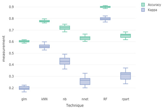 The dataset was randomly partitioned into the training set (80%) and the testing set (20%). The training dataset was used to build the classifier models using different classification algorithms including a generalized linear model, k-nearest neighbors, naïve Bayes, neural net, random forest, and recursive partitioning. The performance of the trained classifiers was then evaluated using accuracy and kappa statistics. Figure 3 illustrates the results of the trained model performance. The overall performance effectiveness of a classifier indicated using accuracy and kappa statistics showed that random forest (accuracy = 0.921, kappa = 0.788) was the best classifier, followed by k-nearest neighbor (accuracy = 0.775, kappa = 0.554) and naïve Bayes (accuracy = 0.723, kappa = 0.433).