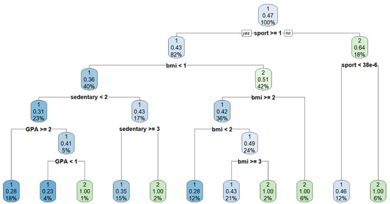 As the top performing classifier (random forest) represents an implicit (black box) model, Figure 4 illustrates an example of a single decision tree from the aggregate forest model that illustrates one explicit classification strategy for predicting poor mental well-being as different combinations and arrangements of these features are possible in the forest. In this example, when the feature “sports” is first considered, those who were underweight, had a higher sedentary lifestyle, and had a higher-grade point average were more likely to be classified as “poor” mental well-being.