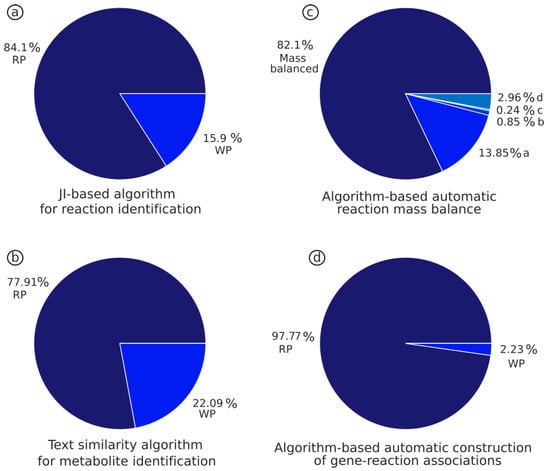 Results of assessment of the different algorithms developed for this protocol. (a) Text similarity algorithm to identify metabolites. Graphical representation of the results obtained using a threshold of 0.82 (other thresholds results can be found in Supplementary Material File S1). Dark blue: percentage of right prediction (RP), light blue: percentage of wrong predictions (WP). (b) JI-based algorithm to identify metabolic reactions. Dark blue: percentage of right prediction (RP), light blue: percentage of wrong predictions (WP). (c) S-GPR building algorithm. Dark blue: percentage of right prediction (RP), light blue: percentage of wrong predictions (WP). (d) Algorithm to mass balance metabolic reactions. Dark blue: percentage of reactions mass balanced by the algorithm; the different tones of lighter blue represent cases where the reaction was not mass balanced due to: a. an exchange reaction that is imbalanced by definition, b. a mixture of molecular and glycan building block formulas that cannot be mass balanced, c. at least one of the metabolites having no annotated formula or d. coupled reactions that cannot be mass balanced unless the reactions are decoupled and mass balanced separately.