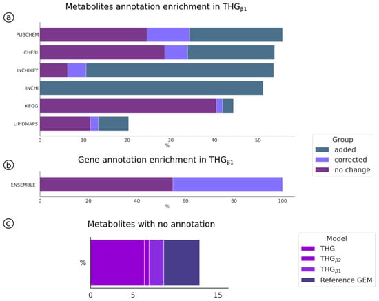 Metabolite and gene annotation enrichment in THGβ1. (a) Percentage of metabolite IDs corrected (lila), added (dark green) in THGβ1 or right in the reference model (purple). (b) Percentage of gene Ensembl IDs corrected or added in THGβ1. (c) Overall percentage of metabolites with no annotation in THGβ1, THGβ2 and the reference model.