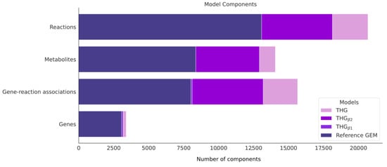 Number of different model components (reactions, metabolites, genes and gene-protein-reaction associations) in the THG model series and the reference model.