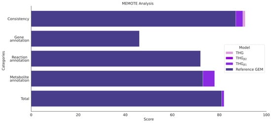 The metabolic network models were assessed using MEMOTE, a standardized pipeline for GEM testing (Figure 1 step 7). This pipeline tests the consistency of mass balance, energy and biomass cell functions, as well as the annotation and gap filling of the metabolic network models. The GEMs generated using the developed protocol achieved similar scores to the reference model. Here, THGβ1 achieved a score of 82, and THGβ2 and THG achieved 81, while the reference model was scored as 81 (out of 100) (Figure 6).