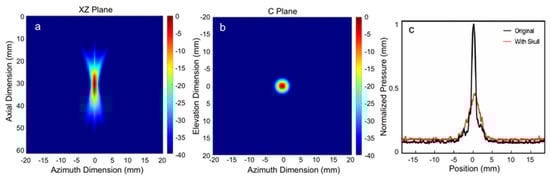 The results of the pressure distribution simulation performed using FIELD II. The pressure field was measured in two planes, the YZ Plane (a) and the C Plane (b), without the presence of the skull. To investigate the impact of the rat skull on the pressure distribution, 1D-scan measurements were performed using a hydrophone both with and without the skull (c).