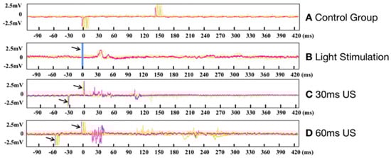 (A) The whole device placed in water (control experiment), (B) light stimulation (the arrows and blue line show the stimulation time), and there were some spikes after 30 ms, (C) 30 ms ultrasound stimulation on the visual cortex (the arrow indicates the position of the initial pulse), (D) the 60 ms ultrasound stimulus.