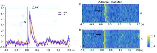 The photometry results can be seen in Figure 5, which illustrates the neuronal response evoked by both light stimulation and US. The pre-trigger signal indicated by the arrow represents the actual US given. A Z-Score heatmap was calculated based on the normalized data counts across 12 trials in each group. Notably, US (30 ms) evoked a faster neuronal response in the VC than light stimulation, which also corresponded to the EEG signal shown in Figure 4 for demonstrating a more rapid response to US.