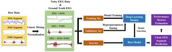The electrophysiological activity of the cerebral cortex of the human brain is represented by electroencephalogram (EEG) signals, which are non-invasively recorded at the scalp []. EEG is crucial for various therapeutic applications as well as neurological research. Long-duration human epileptic seizure episodes are routinely detected with EEG [,]. EEG is also widely used for other purposes, such as Alzheimer’s disease diagnosis [,], sleep stages measurement [], assessment of cognitive workload [], recognition of human emotion [], establishing brain-computer interfaces (BCIs) [], biometric systems [], etc. EEG recordings, nevertheless, greatly suffer from a range of physiological and non-physiological artifacts, such as ocular/electrooculogram (EOG) artifacts [], myogenic/electromyogram (EMG) noises [], cardiac/electrocardiogram (ECG) abnormalities [,], power line noise and motion artifacts [,,]. These noises will significantly impact the EEG data analysis outcome and may even lead to an entirely wrong diagnosis in the worst cases. To remove the physiological artifacts and maintain the neural information of EEG as much as possible, it is required to develop efficient, reliable, and robust algorithms/models.