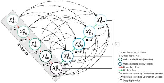 Our proposed MultiResUNet3+ model for segmentation effectively combines the concepts of MultiResUNet [] and UNet3+ [] networks inside a single framework. The building blocks of the 1D-MultiResUNet3+ model used in this study (depth of 5) have been depicted in Figure 2.