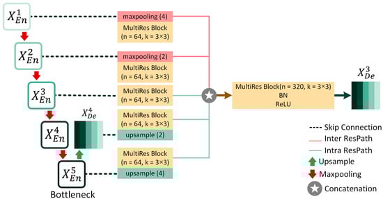 On the other hand, higher-level semantic information is conveyed from the larger-scale decoder layers, such as and , through intra-ResPath connections by utilizing nearest interpolation. Now, as in Figure 2 and Figure 3, there are five total inter- and intra-Residual Paths (Figure 4) containing same-resolution feature maps waiting to be unified before reaching . To properly merge the shallow and deep semantic information, we perform a feature aggregation mechanism on the ResPaths by placing a Multi-Residual or MultiRes Block (Figure 5) containing input kernels or filters of size after concatenating the five feature maps. Here, n denotes the input filter number, and the depth of the model is represented by d. For example, if n is 64 and d is 5, W will be 320.