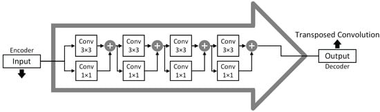 UNet3+ consists of full-scale skip connections combining interconnections between the encoders and the decoders and intra-connections between the decoder sub-networks. Unlike UNet [] and UNet++ [], UNet3+ can incorporate small and larger-scale feature maps in each decoder layer, allowing it to extract fine and coarse-grained semantics in full scales. It was employed in the MultiResUNet3+ for this application to effectively minimize semantically different EOG and EMG artifacts from EEG waveforms. EMG requires a finer approach, while EOG-induced impurities are coarser. Nevertheless, UNet3+ still used direct skip connections for inter- and intra-connections, prevailing the semantic gap issue in the basic UNet architecture, which was solved by more advanced architectures, such as UNet++ and MultiResUNet. To reduce the semantic gap, MultiResUNet or similar architectures proposed replacing the skip connections with various formations of convolutional blocks. Reducing the semantic gaps in this application will help the model efficiently learn and generate EEG features, especially when EOG and EMG noises are mixed, to create a more realistic but challenging scenario. Therefore, contrary to UNet3+, our proposed MultiResUNet3+ contains full-scale Residual Paths (Figure 3) instead of direct skip connections for inter- and intra-connections. Instead of combining the encoder and decoder features straightforwardly (e.g., concatenation in UNet and addition in LinkNet []), the encoder features are passed through several convolutional layers with residual connections (Figure 4). Mentionable that residual connections [] have been beneficial in several deep learning applications during their learning process. The depth of the network affects how many residual-convolutional blocks are used in the inter- and intra-ResPaths for MultiResUNet3+. For example, for the model drawn in Figure 2 with a depth of 5, the number of residual-convolutional blocks along the inter-ResPaths will be 4, 3, 2, and 1, respectively, generated from shallower to deeper layers. On the other hand, for the intra-ResPaths densely connecting the decoders, the number of residual-convolutional blocks will be 1, 2, 3, and 4, respectively, from deeper to shallower layers. More residual-convolutional blocks are placed along the ResPaths generated from a shallower layer for improved processing of the coarser features.