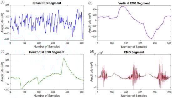 Several signal-processing techniques were adopted by the EEGdenoiseNet [] authors. They processed the clean EEG signals (collected from several sources) by applying a bandpass filter with the lower and upper cutoff frequencies of 1 and 80 Hz, removed the power line noise using a notch filter, and then down-sampled at 256 Hz. The clean EEG signals were then segmented, and 4514 clean EEG segments were generated, each containing 512 data points. The clean EOG signals (horizontal and vertical) were bandpass filtered with a passband of 0.3–10 Hz, resampled to 256 data points per second. These processed clean EOG signals were segmented, and 3400 segments were produced, where each clean EOG segment has 512 data points, the same as the EEG segments. The EMG signal was filtered using a bandpass filter with a lower cutoff frequency of 1 Hz and upper cutoff frequency of 120 Hz, and the powerline frequency component was removed using a notch filter. Then the raw EMG signals were resampled to 512 data points per second, and 5598 clean muscle/EMG segments were generated, each containing 1024 data points []. As EMG signals have essential features in the high-frequency band, the clean EMG signals were sampled at 512 Hz to retain those features and morphology. Figure 6 depicts one clean EEG, one clean vertical EOG, one pure horizontal EOG, and one clean EMG segment sample. Since the authors of [] adopted all the necessary pre-processing techniques, no further pre-processing steps were undertaken in this study. Instead, the publicly available segments are directly used to produce a large and diverse semi-synthetic corrupted EEG dataset.