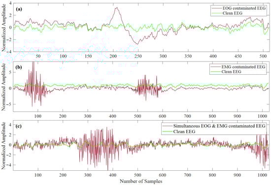 Similarly, EMG-contaminated EEG segments were created by combining the EEG segments with the randomly selected clean EMG segments for 10 different SNR levels. Before linearly mixing EEG and EMG segments, all the clean EEG segments were up-sampled by a factor of 2 to match the number of data points each EMG segment contains. The upsampling of EEG (from 256 to 512 Hz) did not cause any morphological change in EEG segments as the bandwidth of EEG is 1–80 Hz []. Eventually, we generated 45,140 EMG-contaminated EEG segments for the ten different SNR levels semi-synthetically. The simultaneous EOG and EMG contaminated EEG segments were generated by mixing the 3400 clean EEG segments (randomly taken out from 4514 clean EEG segments) with 3400 EOG and 3400 EMG (randomly taken out of 5598 EMG segments) segments for ten different SNR levels. The clean EEG and EOG segments were up-sampled at 512 Hz before linear mixing to match the sampling frequency of the EMG segments. This process generated 34,000 corrupted EEG segments for all ten different SNR levels. Figure 7a displays a picked at-random EOG-contaminated EEG segment. Figure 7b illustrates one arbitrary EMG-contaminated EEG segment, whereas Figure 7c represents one random sample of simultaneous EOG and EMG-contaminated EEG segments. The corresponding ground truth EEG segments are also superimposed in Figure 7a–c.