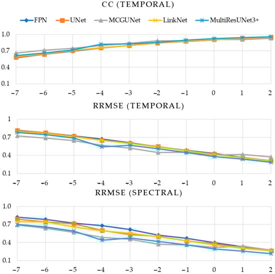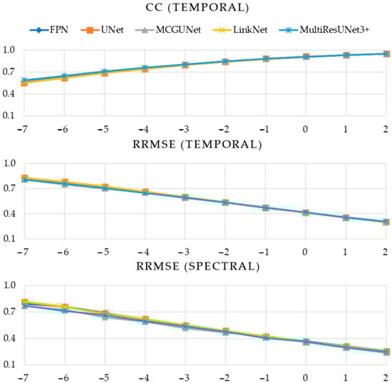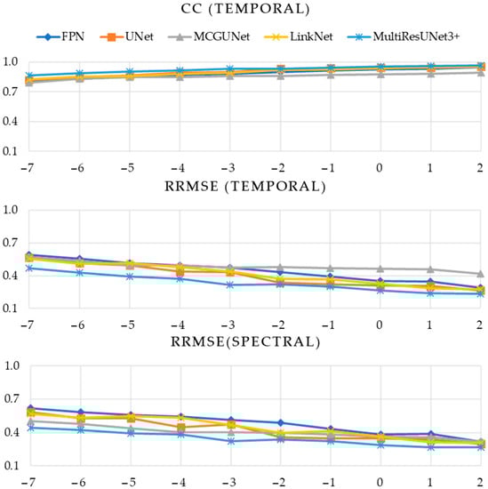 Similarly, for ten different SNR levels, EMG-contaminated EEG segments, and simultaneous EOG and EMG-contaminated EEG segments, were utilized for training and testing all five networks ten times separately. Employing a deep supervision technique as described in [], in this experiment, we computed three established performance metrics, namely the correlation coefficient (CC) in the time domain, and temporal and spectral relative root mean squared error (RRMSE). These metrics were particularly used to evaluate the effectiveness of the five DL-based models in denoising contaminated EEG. The five-fold cross-validation technique was employed, and the metrics mentioned earlier were computed for each of the five folds to ensure robustness and reliability in the evaluation process.