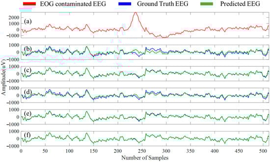 Figure 11a depicts an EEG segment that has been contaminated with EOG artifacts, while Figure 11b–f illustrates EOG artifact-free EEG segments (estimated clean EEG) for all five models. Table 4 provides the average numerical values of the four performance metrics () by the five distinct models. In contrast, Table 5 illustrates the computed average power ratios for five separate EEG bands for ground truth, noisy, and predicted EEG segments.