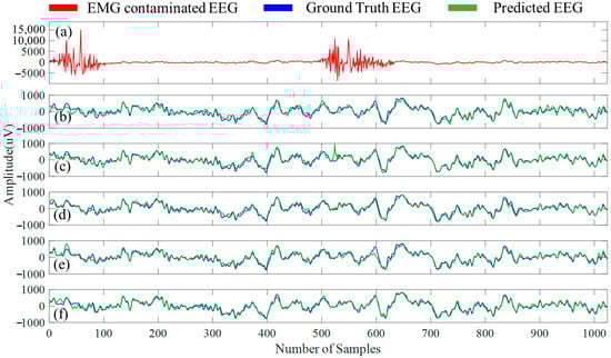 An example EMG-contaminated EEG segment is illustrated in Figure 12a, and to provide a qualitative overview of the five denoising 1D-CNN models, Figure 12b–f shows EMG artifacts-free EEG (predicted EEG) segments. Table 6 summarizes the four performance metrics () obtained for the predicted EMG artifacts-free EEG segments by all the five 1D-CNN models separately, and Table 7 contains the average power ratio calculated for five different EEG bands before and after the removal of myogenic artifacts.