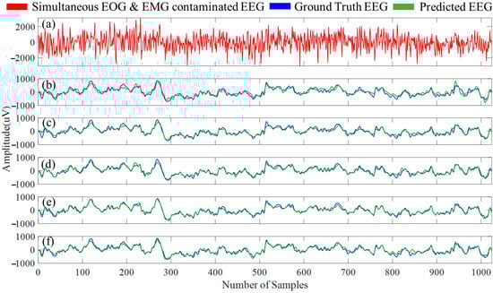 In Figure 13a, an example segment of simultaneous EOG and EMG contaminated EEG segment is presented, and in Figure 13b–f, the denoised EEG segment (simultaneous EOG and EMG artifacts-free segment) along with the ground truth EEG is shown separately for the five 1D-CNN models. The four performance metrics for the five 1D-CNN models’ predictions on the denoised simultaneous EOG and EMG-contaminated EEG segments can be found in Table 8, whereas Table 9 provides the average power ratio between five different EEG bands before and after removing simultaneous EOG and EMG artifacts.