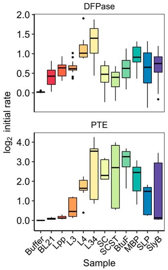 - Thakur, M.; Dean, S.N.; Moore, M.; Spangler, J.R.; Johnson, B.J.; Medintz, I.L.; Walper, S.A. Packaging of Diisopropyl Fluorophosphatase (DFPase) in Bacterial Outer Membrane Vesicles Protects Its Activity at Extreme Temperature. ACS Biomater. Sci. Eng. 2022, 8, 493–501. [Google Scholar] [CrossRef]