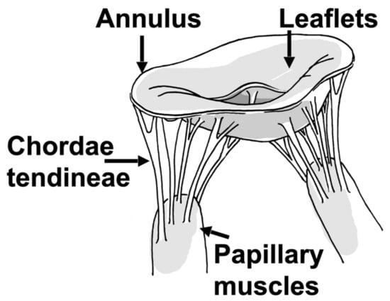 - Dal-Bianco, J.P.; Aikawa, E.; Bischoff, J.; Guerrero, J.L.; Handschumacher, M.D.; Sullivan, S.; Johnson, B.; Titus, J.S.; Iwamoto, Y.; Wylie-Sears, J.; et al. Active adaptation of the tethered mitral valve: Insights into a compensatory mechanism for functional mitral regurgitation. Circulation 2009, 120, 334–342. [Google Scholar] [CrossRef]