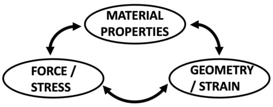 Built on human and/or preclinically created in vivo data, computational modeling can extend tissue modifications beyond those observed or render in vivo models to test a broader range of properties, including the MV–LV interaction. Additionally, biomechanical interactions between the structural cardiac components can be created in a very controlled environment. However, computational modelling is inherently based on a series of assumptions regarding the mechanical properties and fatigue of different tissues and biological responses that researchers are not certain to be true with regard to human physiology [,]. Hence, the findings might not always be entirely translatable to in vivo conditions. Computational models also need to be informed and correlated with the biomechanical force balance of the different components of the MV in order to obtain the correct material properties [,,,]. This is based on the simple relationship between force, structure, and material properties. If two of these are known, the third can be unambiguously determined (Figure 2).