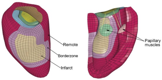 Finite element model of the left ventricle with mitral valve to provide insight into ischemic mitral regurgitation. Left: Exterior view of the left ventricle showing posterobasal myocardial infarction. Right: Interior view of the left ventricle with chordae connected to the papillary muscles. LV and MV built based on magnetic resonance tomography images of an ischemic MR ovine model using FindTags and FindContours software. Chordae tendineae reconstructed in approximation from anatomic images of an excised mitral valve. Surface meshes were applied to the model to replicate in vivo geometry. Border zone defined as steep decline in LV wall thickness between normal and infarcted zones. Tissue properties modeled as nearly incompressible, transversely isotropic, and hyperelastic [].