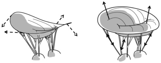 The issues with prolapsing leaflets arise when the natural balance of chordal forces to seat the valve is disturbed. If the total annulus area remains constant and certain areas of the valve experience less strain and tension, it is expected that other areas of the valve must experience a higher degree of tension in the tissue structures (Figure 5). As will be shown below in Section 2.2.3, the leaflet shape is highly impacted by the chords. Considering the collagen direction across the surface of the leaflets [,], they are perpendicular to the LV/leaflet convex shape in the septal-lateral direction, but parallel in the orthogonal direction, where the LV/leaflet concave shape dictates a higher load. These shapes are also visible in 2D and 3D echoes across species (human, porcine, ovine.) Mitral valve prolapse is further described in Section 4.1.