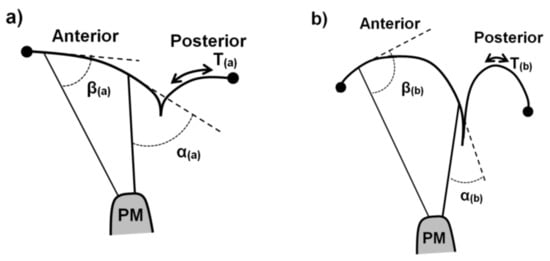 Simplified schematic illustration of (a) healthy vs. (b) prolapsing billowing mitral valve leaflet coaptation. Only two chords inserted into the anterior leaflet (basal and secondary positions) are shown for clarification. α and β illustrate angles between chordal insertion and leaflet tangents, respectively. T nominates tissue tension, which is smaller when the radius of curvature is smaller. This paradox leads to an unhealthy force balance in the valve.