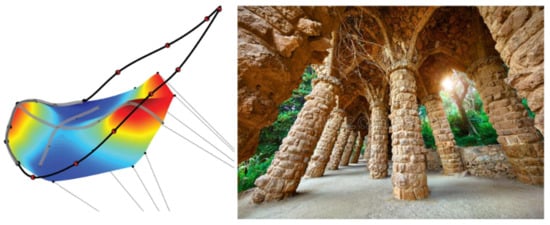 Marginal chordae are frequently called primary, and strut and basal chordae are summarized as secondary chords (Figure 6). MV chordae are a key element of the MV–LV complex, and their integrity is not only crucial for optimal MV function, but also for the maintenance of optimal geometry and global function of the LV [,,]. As leaflets and chords model from the embryonic state as the stretching of cushions in the developing heart, Lam et al. has described “cleft chordae” that split shortly after arising from the PMs into different zones of the leaflets, and produce an interesting potential effect on MV closing [,]. The chordal network has an important function to set the leaflets into a specific initial 3D geometric configuration (stiff hyperbolic paraboloid anterior leaflet saddle shape, radially convex, circumferentially concave to the LV) at the time of the initial systolic increase of LVP []. This enables the leaflets to undertake a near self-supporting structure under the high systolic pressure of the ventricle. Similarly, the amazing arches in Gaudi’s Park Güell in Barcelona are self-supporting under the weight of gravity acting as the equivalent force of pressure (Figure 7). Any disturbance of this shape, including prolapse, impacts the self-supporting nature of the valve leaflets, and increases the load on the anchor points, including the subvalvular apparatus.