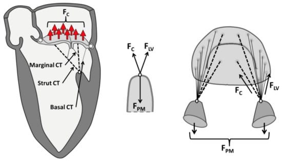 Separating the components of the PM force into the closing force (FC) and a potential valvular–ventricular interaction force (FLV). Reprinted with permission from []. 2013, Elsevier.