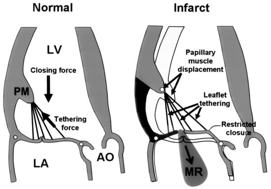 Changes in LV dimensions or geometry associated with persistent damage after myocardial infarction (MI) of the inferior LV segments lead to displacement of the papillary muscles (PMs) and subsequent tethering of the MV leaflets []. This condition is exacerbated by annular dilatation that occurs as part of the LV dimensional changes []. As a consequence, leaflet coaptation is incomplete, which causes ischemic MV regurgitation (IMR, see Figure 9).
