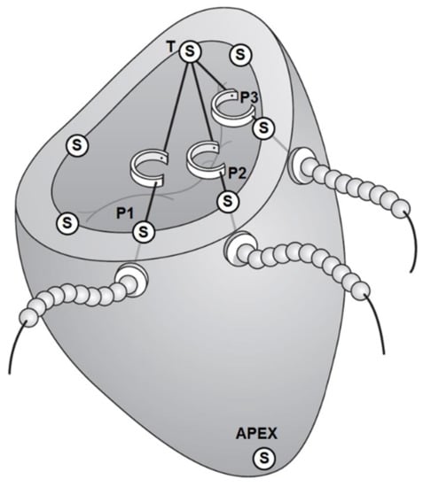 Measuring MV annulus downsizing forces. The sutures are anchored at the posterior trigone (T) and externalized at the posterior scallops (P1, P2, P3). Seven sonomicrometry crystals (S) are implanted at the annulus and one at the apex (S) of the left ventricle. Reprinted with permission from []. Copyright 2014, Elsevier.