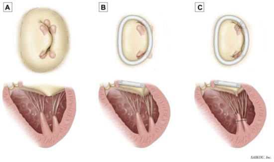 Surgical approach to (A) ischemic mitral regurgitation with (B) annuloplasty alone or (C) annuloplasty plus papillary muscle approximation. Reprinted with permission from []. Copyright 2020, Elsevier.
