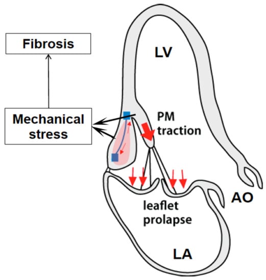 Proposed mechanism of mechanically induced papillary muscle and localized left ventricular fibrosis subsequent of tugging forces exerted by the prolapsing valve. [].