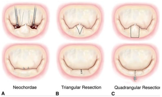 - Padala, M.; Powell, S.N.; Croft, L.R.; Thourani, V.H.; Yoganathan, A.P.; Adams, D.H. Mitral valve hemodynamics after repair of acute posterior leaflet prolapse: Quadrangular resection versus triangular resection versus neochordoplasty. J. Thorac. Cardiovasc. Surg. 2009, 138, 309–315. [Google Scholar] [CrossRef]