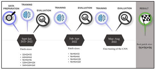 The CNN was trained in a two-phase approach. Firstly, the model was trained using five different cubical patch sizes (32 × 32 × 32, 64 × 64 × 64, 96 × 96 × 96, 128 × 128 × 128, and 160 × 160 × 160). In the second phase, the height of the best-performing input volume (96 × 96 × 96) was modified along the Z axis. Five further models with patch sizes of 96 × 96 × 32, 96 × 96 × 64, 96 × 96 × 128, and 96 × 96 × 160 were trained. The results are displayed in