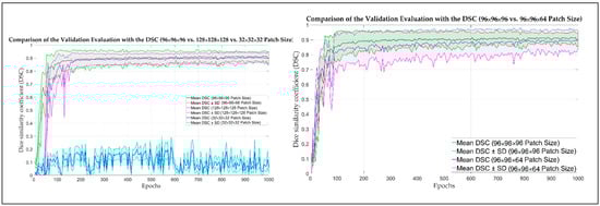 Graph of the evolution of the dice similarity coefficient (DCS) and its standard deviation (SD) of the validation samples for different patch size.
