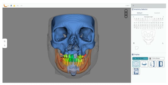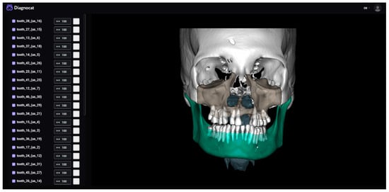 Figure 6) is an established start-up that offers fully automated segmentation for CBCT images and prediagnosis for 2D dental X-rays. The segmented anatomical structures are the toothless mandible, the mandibular teeth (each tooth individually), the inferior alveolar canal, the toothless maxilla, the maxillary teeth (each tooth individually), the cranium, the airways, and the soft tissue. The bone segmentations include cortical and cancellous structures. Diagnocat has a CE mark.