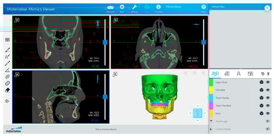 For the segmentation of the mandible, the CMF CBCT segmentation algorithm was used, which was designed to segment both CBCT and CT. The anonymized DICOM files of the test dataset were inserted into a Mimics file, which was then uploaded onto Mimics Viewer and the segmentation was requested. The output of the fully automatic segmentation was a Mimics file containing five segmented parts, which are called “Upper skull”, “Mandible”, “Teeth Maxilla”, “Teeth Mandible”, and “Neck”, containing the anatomy of skull and maxilla, mandible, maxillary teeth, mandibular teeth, and neck, respectively. Only the cortical bone was segmented in the Materialise Mimics Viewer, not the cancellous bone. The inferior alveolar canal was not segmented.