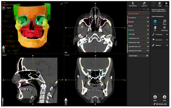 Figure 7) consists of multiple applications and backend services for image processing of medical data (data transfer and exchange, image co-registration, automatic image segmentation, manual contouring, object manipulation, trajectory planning, etc.). The anatomical structures that can be automatically segmented are the optic nerve, eye, midface, skull base, skull base anterior, skull base central, skull base posterior, orbit volume, skull, ethmoid bone, LeFort I Template, LeFort II Template, LeFort III Template, LeFort III-I Template, mandible, mandible body, mandible ramus, frontal bone, maxilla, nasal bone, orbit, orbit floor, orbit wall medial, zygomatic bone, occipital bone, parietal bone, sphenoid bone, and temporal bone. For all bony structures, the cortical and cancellous bones are segmented by Brainlab. Teeth are not part of the segmentation model.