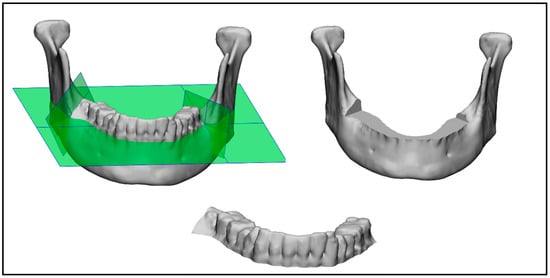 Figure 8). In order to split the mandible into the mandibular teeth and the mandibular bone, 3-Matic was used. For each of the 20 mandibles in the test dataset, the ground truth was used to manually insert three cutting planes (one horizontal and two vertical planes), which were used to automatically cut and split the segmented mandibles for each company using the 3-Matic scripting tool. Two different STL files were obtained, one containing the mandibular bone and one containing the mandibular teeth.