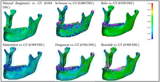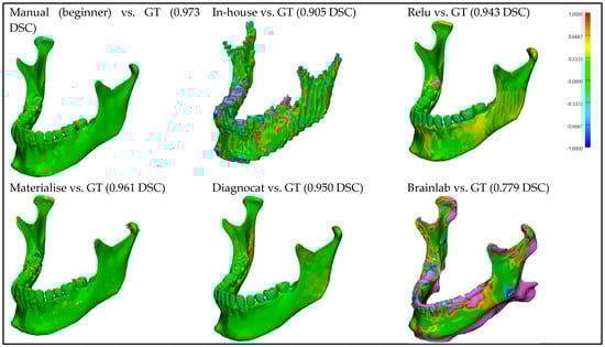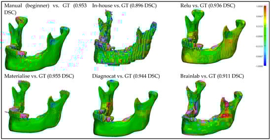 Figure 12)) the first segmented mandible. For that, we used the color mapping of the surface distance between the segmentation and the ground truth (where the segmentation is visible and the ground truth is hidden), with minimum and maximum ranges of −1.0 mm and +1.0 mm.