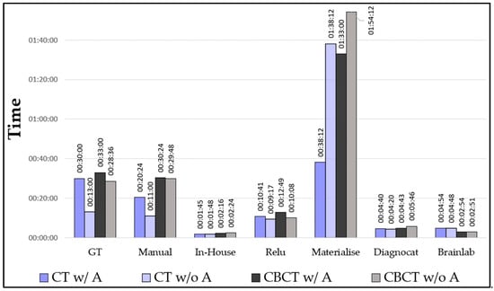 Figure 13). We have shown that our in-house model performed best with the lowest mean time (2′03″), followed by Brainlab (3′54″) and Diagnocat (4′52″). The manually segmented mandibles (those from the expert and the inexperienced user) showed similar timings (26′09″ and 22′54″, respectively). Materialise showed the highest mean value (85′54″).