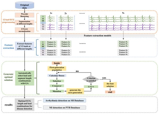 As shown in Figure 1, the method proposed in this paper can be mainly divided into four parts: the first one is the original signal preprocessing, which includes signal denoising, signal segmentation to different lengths, and signal normalization. The second is to extract the features of 12 leads separately under different segment lengths. Then, the optimal solutions for the combination of ECG leads and segment length are automatically generated by a GA-based algorithm. Finally, the final classification results can be obtained. Detailed descriptions of each part are as follows.