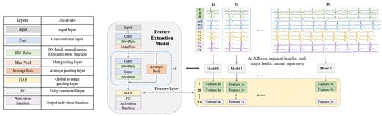 As shown in Figure 2, the feature extraction model (FEM) is developed on the basis of ResNet. Since each disease and each lead requires feature extraction for nine fragment lengths (1 s to 9 s), for inputs of different sizes, nine networks suitable for segment lengths from 1 s to 9 s are designed by modifying the input layer. Each network contains 13 convolutional layers and the structure and configuration are shown in Table 4. The feature extraction process is performed by the FEM trained on the classification task. For the different classification tasks (arrhythmia and myocardial infarction), the feature extraction models can be obtained by modifying the number of nodes in the fully connected layers and the activation function in the network, respectively. For the SH database, the FEMs are trained on the classification task of normal ECG, PAC, PVC, tachycardia, and bradycardia, so the number of nodes in the fully connected layer is set to 5 and the activation function is Softmax. For the PTB database, the models are trained using a binary classification task of MI and normal signal, so the number of nodes in the fully connected layer is set to 2 and the activation function is sigmoid. Each lead is trained separately at each length to obtain features. Finally, the training set and test set data are re-input into the trained FEM, and the output of the global average pooling (GAP) layer in the network structure is used as the final extracted features. In this way, features for two disease categories (arrhythmia and myocardial infarction) are obtained, each containing 12 leads at 9 ECG lengths. These features can be used directly in later classification, for example, when testing the case of ECG lengths for 3 s and lead combinations for II, avR, V3, and V4, the features of the 4 leads with a heartbeat segment of 3 s are directly selected and concatenated, and then the classifier is used to classify and test the performance.